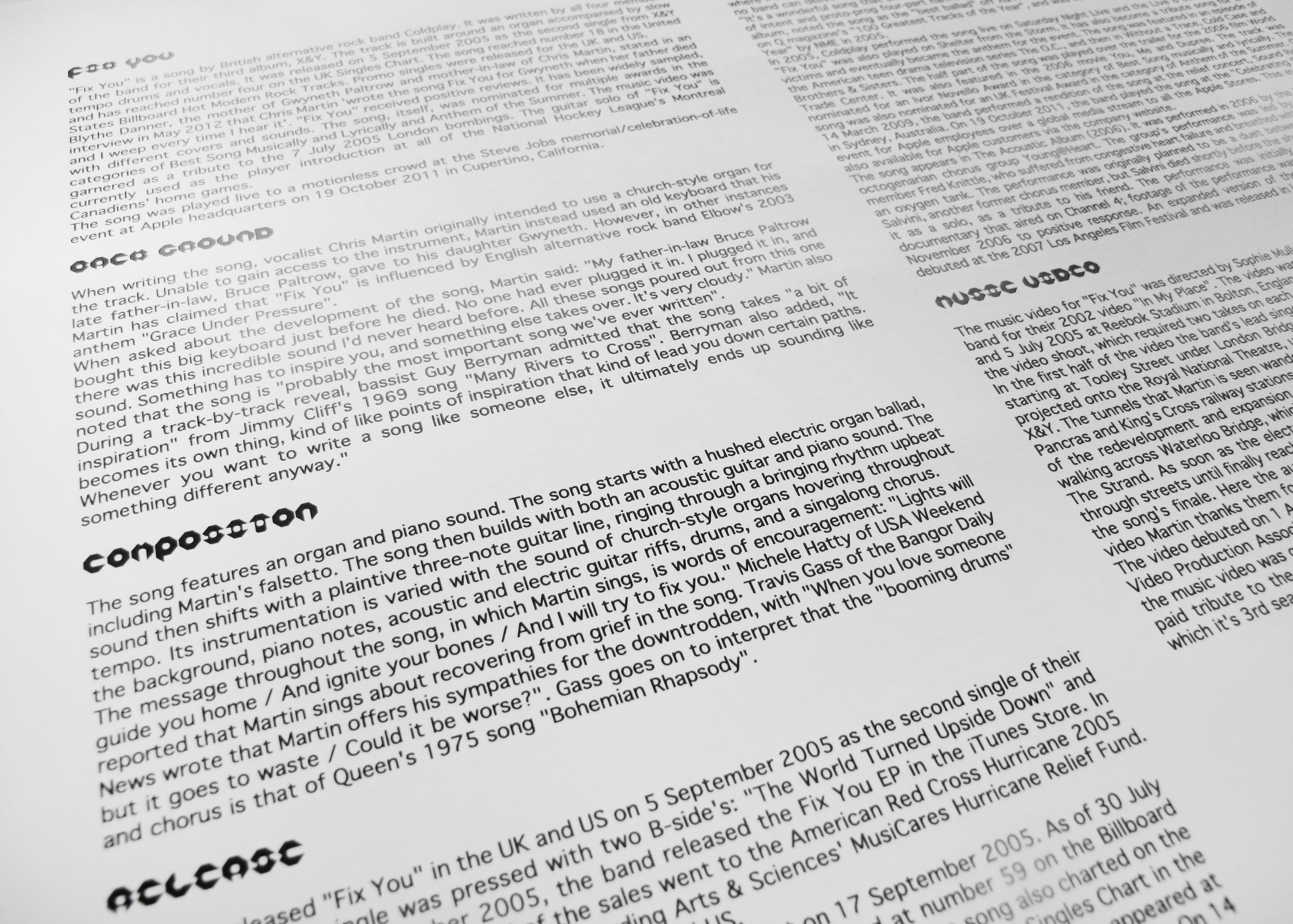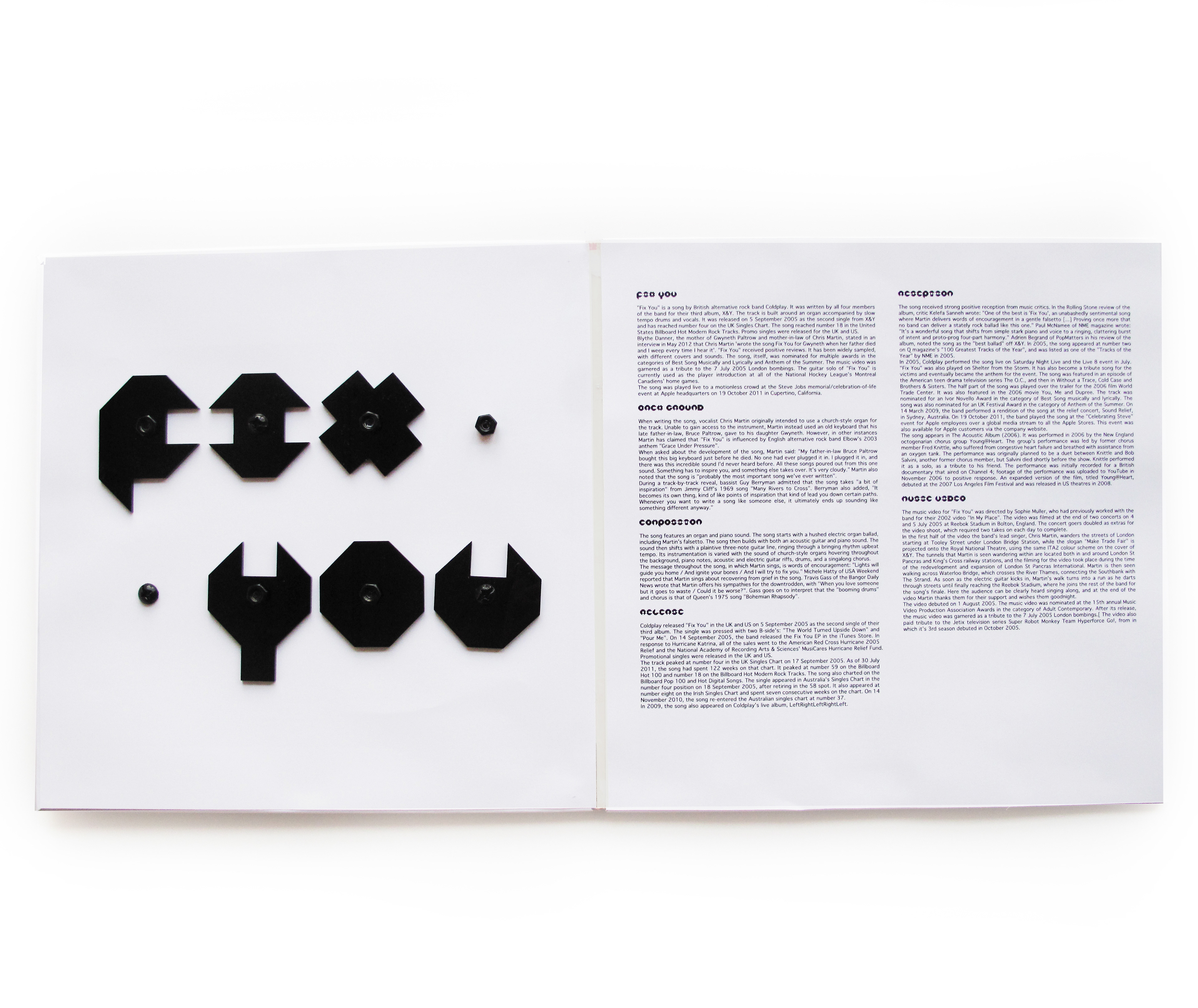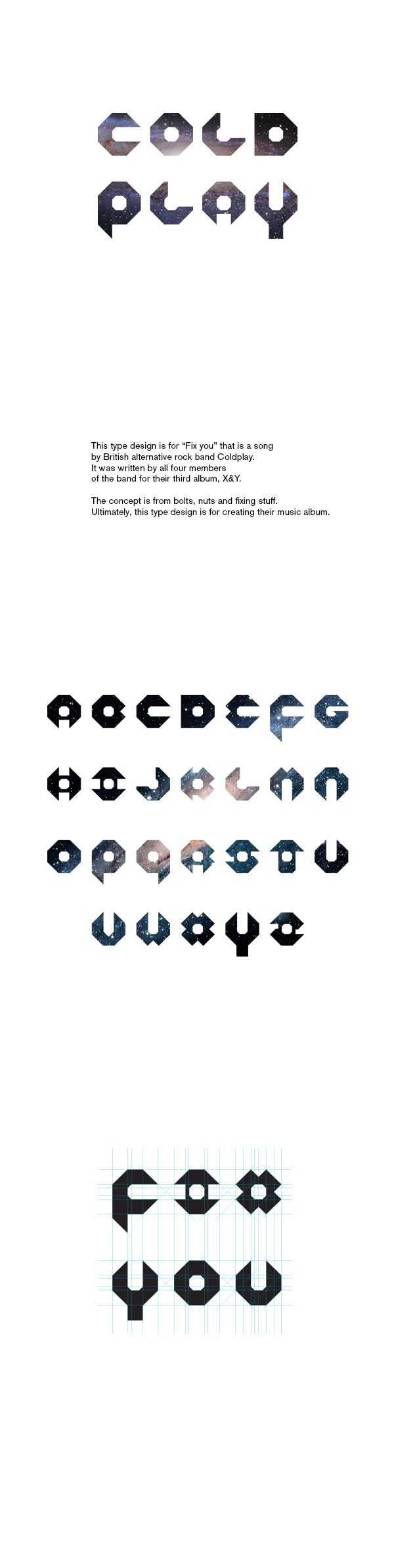 Vinyl Cover design & Typography design School Project (SVA) Instructor: Jessica Walsh It is for specific song, 'Fix You' by Coldplay who is famous British Band. Materials: Acrylic panels, black colored nuts and bolts.
